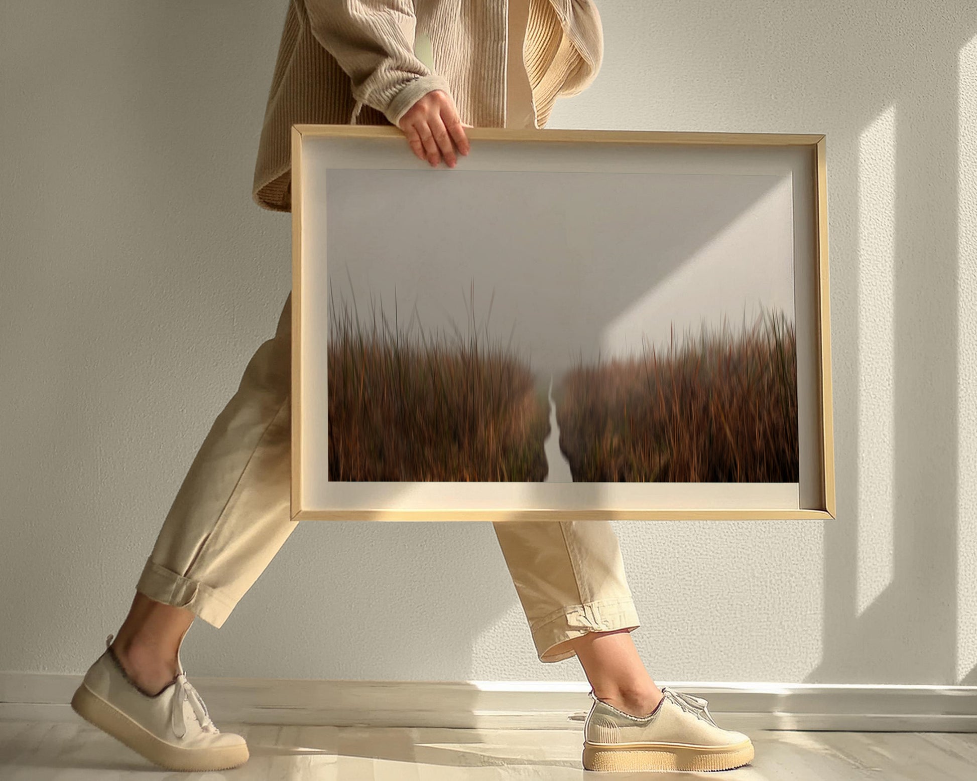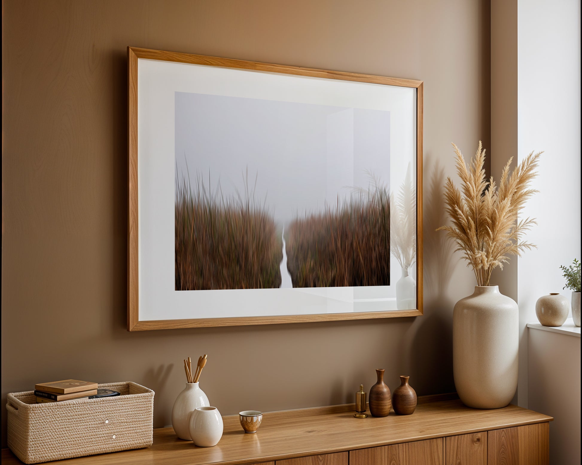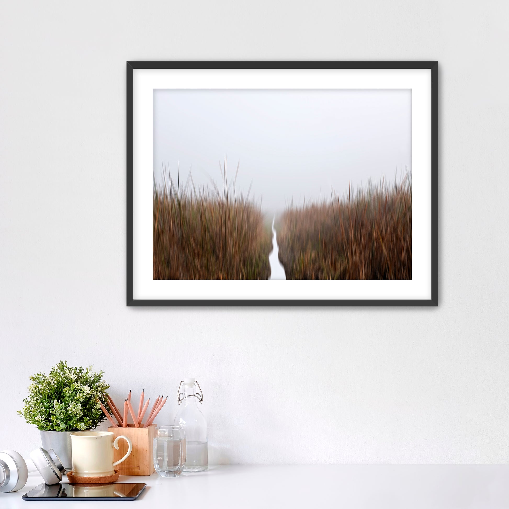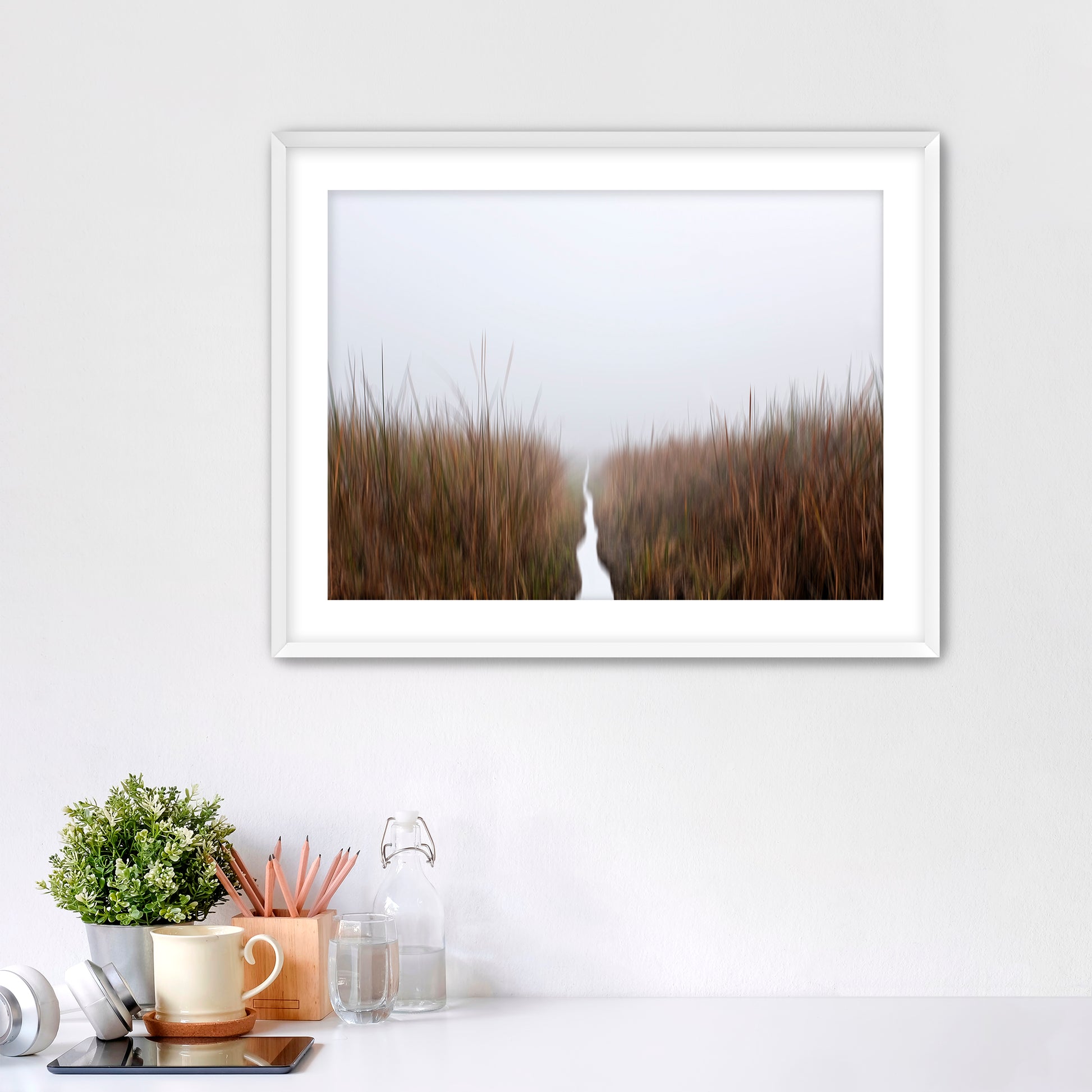 Nature in Motion -- This fine art abstract print captures the beauty of coastal marshlands in a dreamlike blur. With earthy tones of windswept grasses blending into soft, misty hues, "Back Bay Abstract" evokes a sense of quiet movement and harmony.