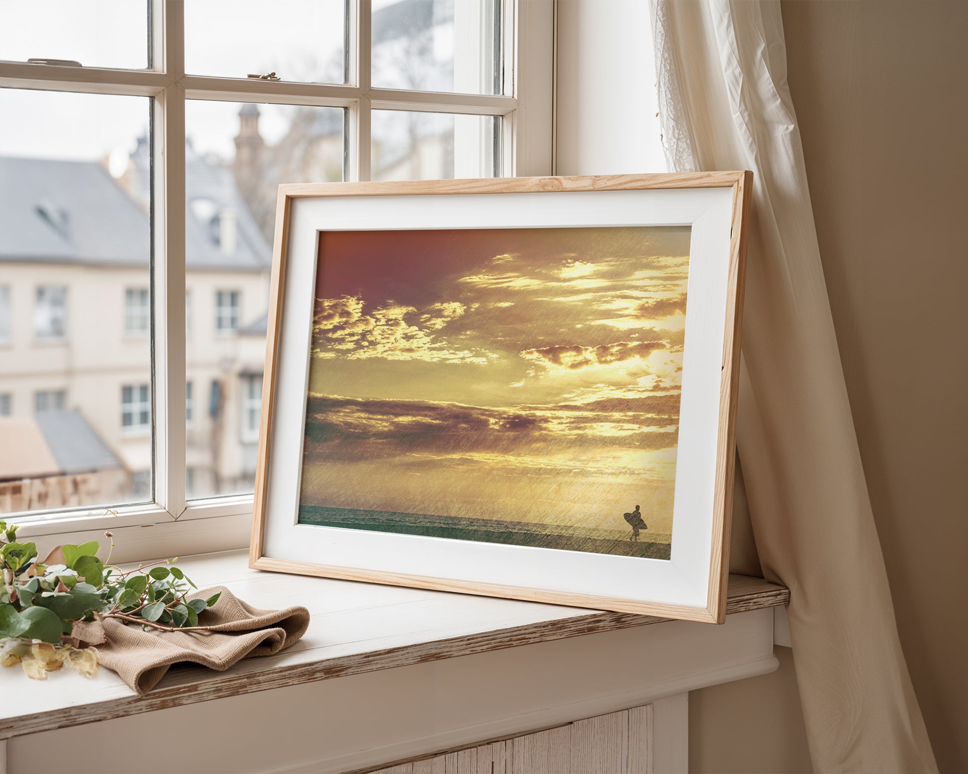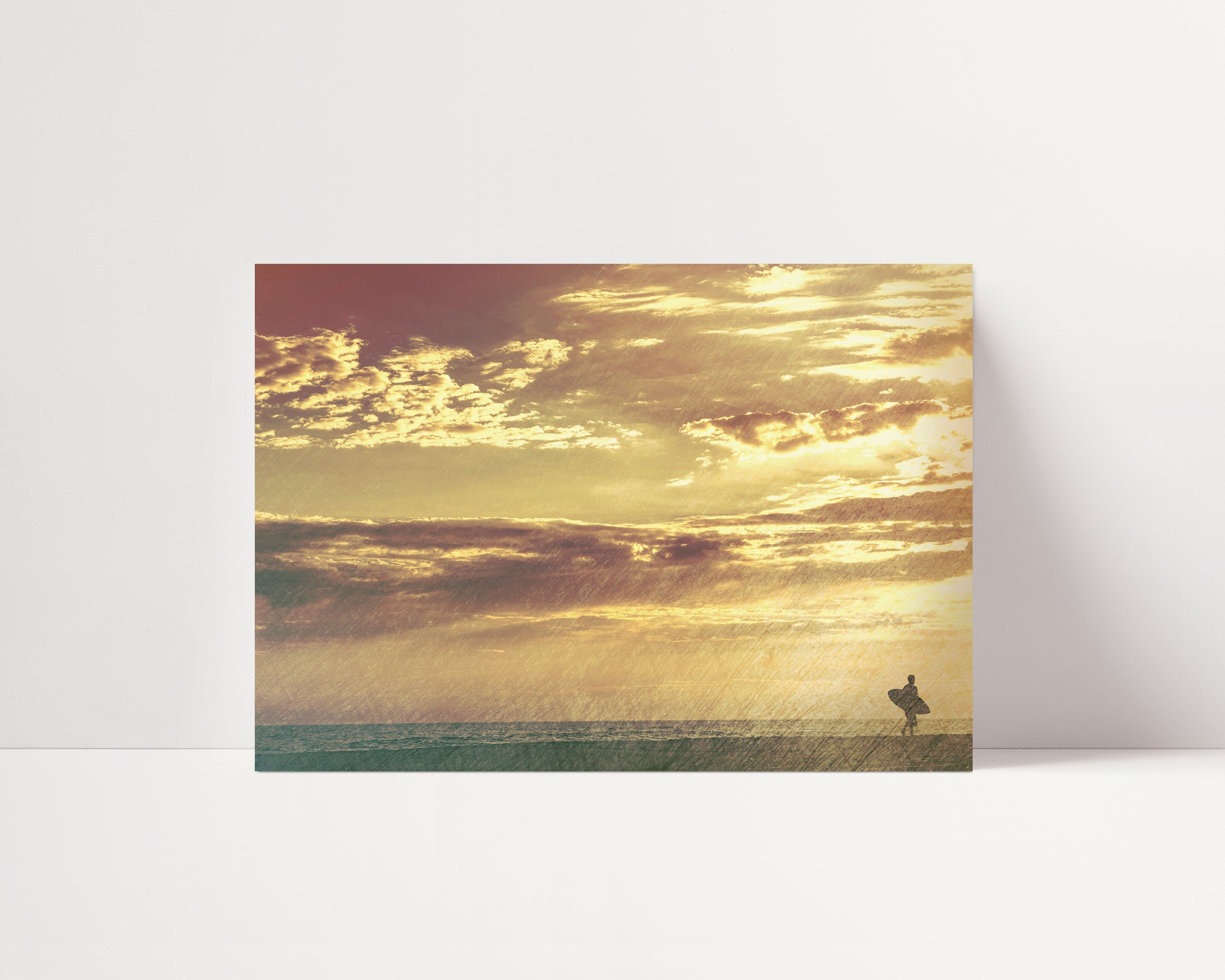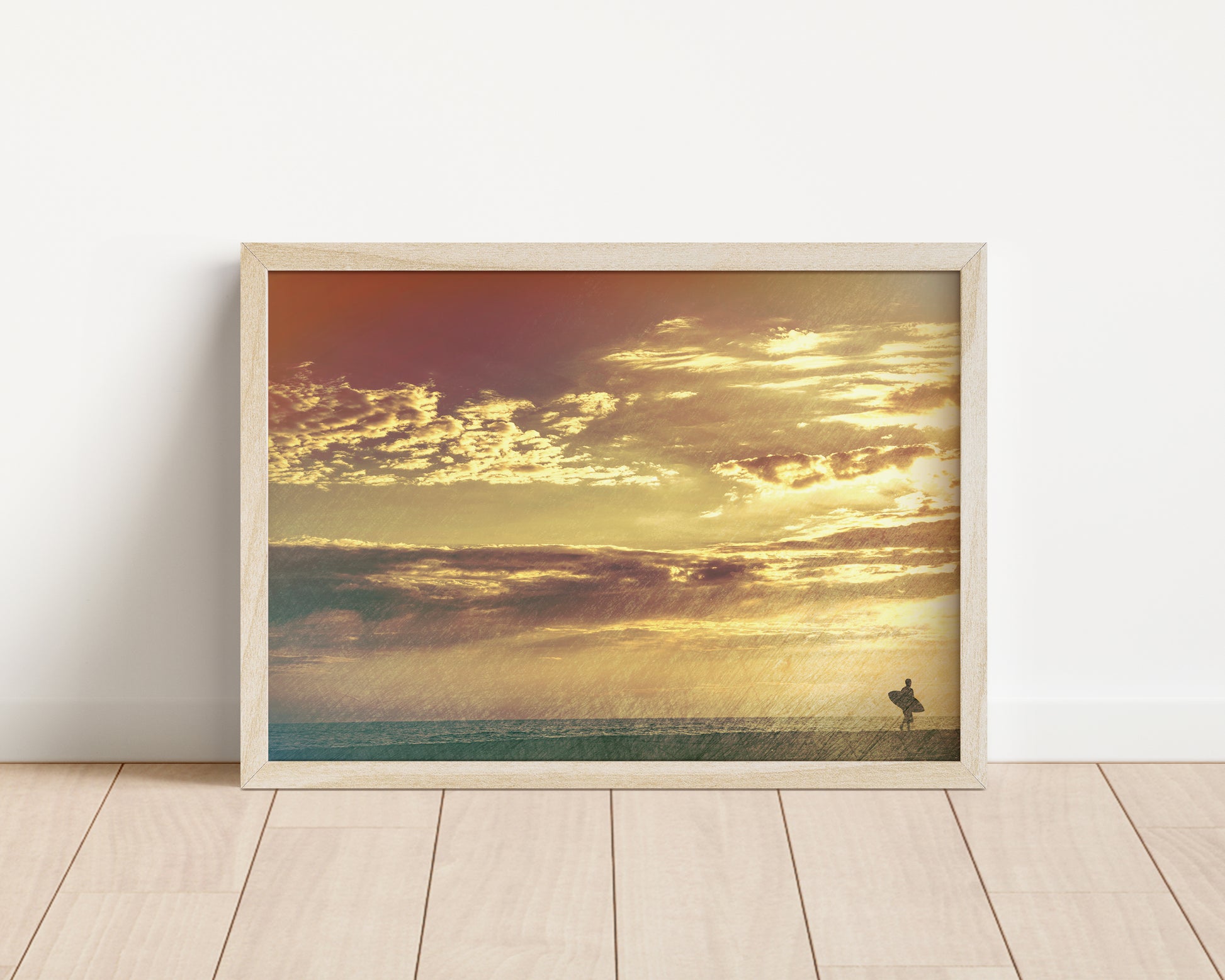Golden Hour Escape -- Capture the essence of freedom and adventure with "Sunset Surf." This fine art print beautifully blends warm golden hues with the silhouette of a lone surfer, evoking the magic of a day’s final ride.