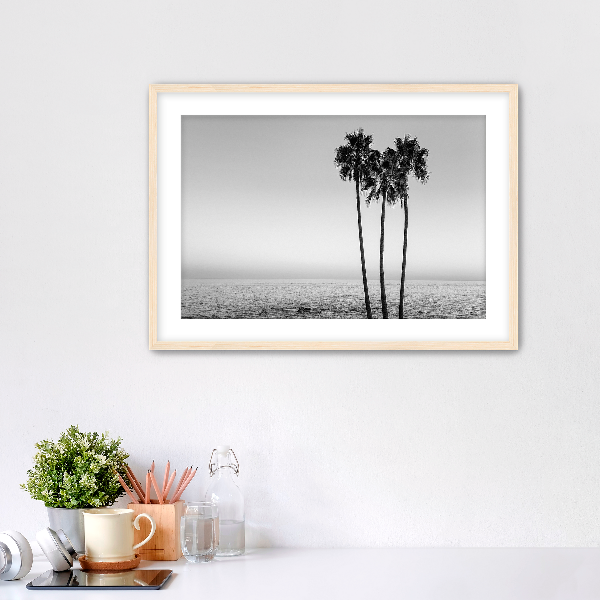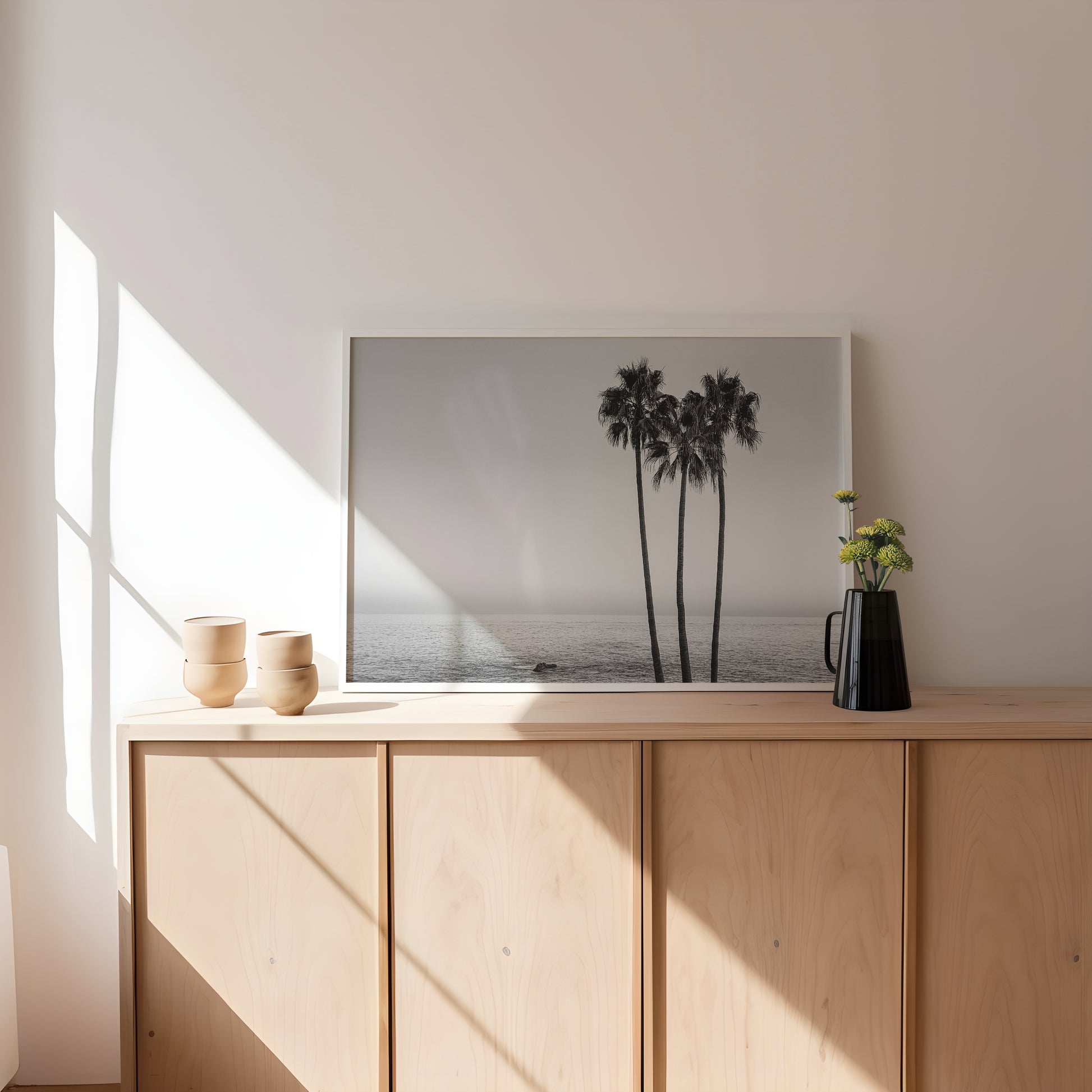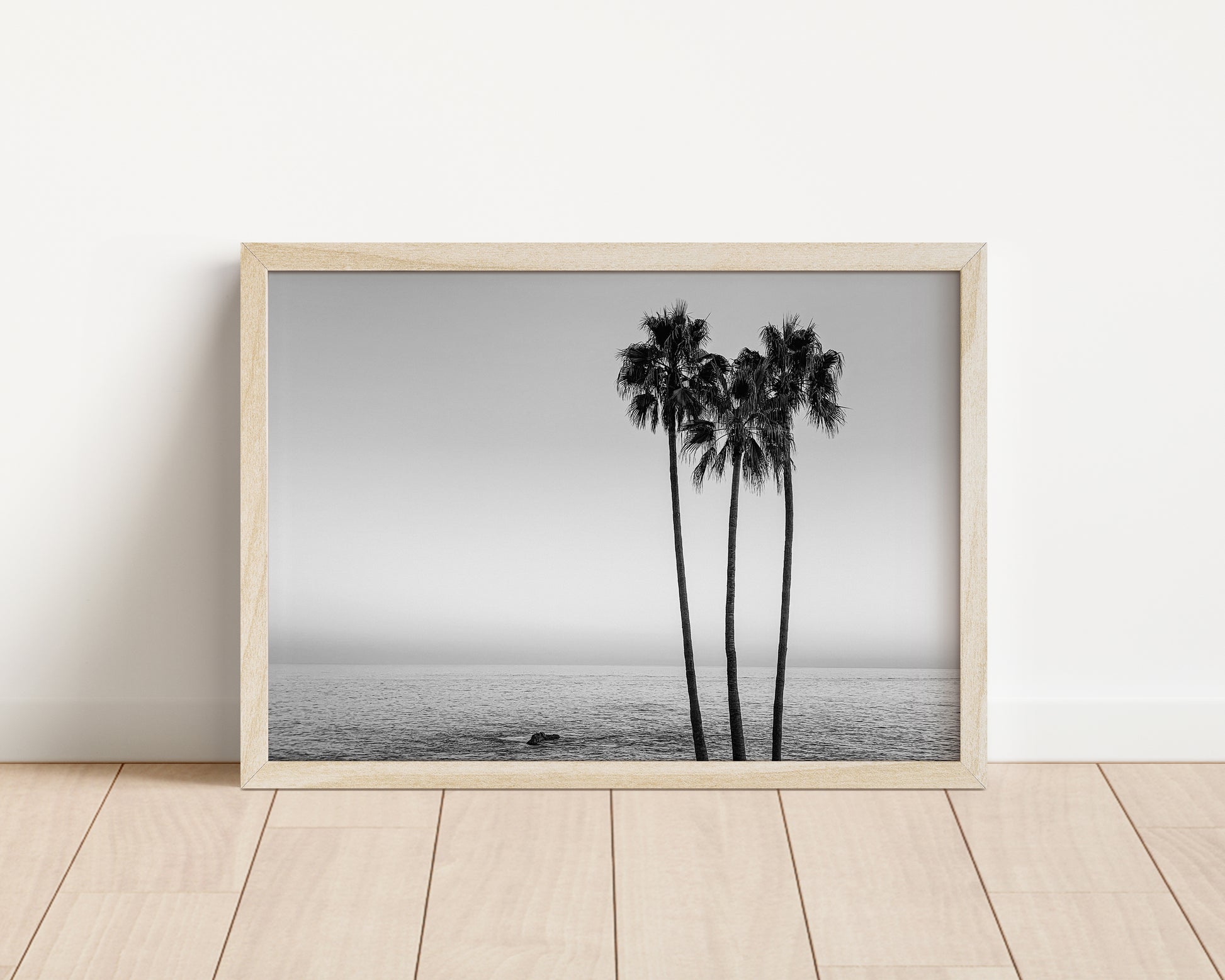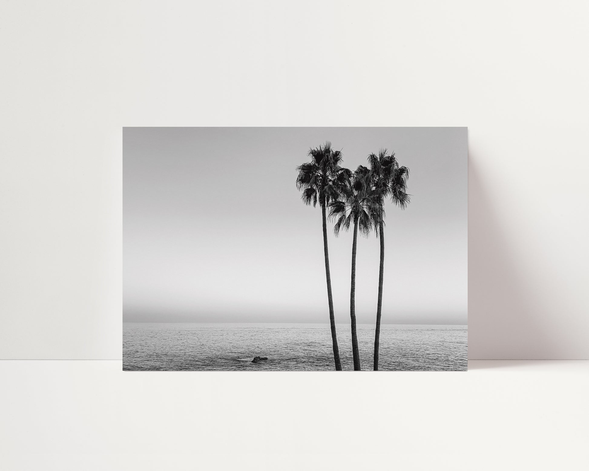 This black-and-white composition, "Party of 3" captures the tranquil beauty of three tall palm trees against the vast expanse of the Pacific Ocean. Their elegant silhouettes contrast against the soft, gradient sky, evoking a sense of calm and timeless simplicity.