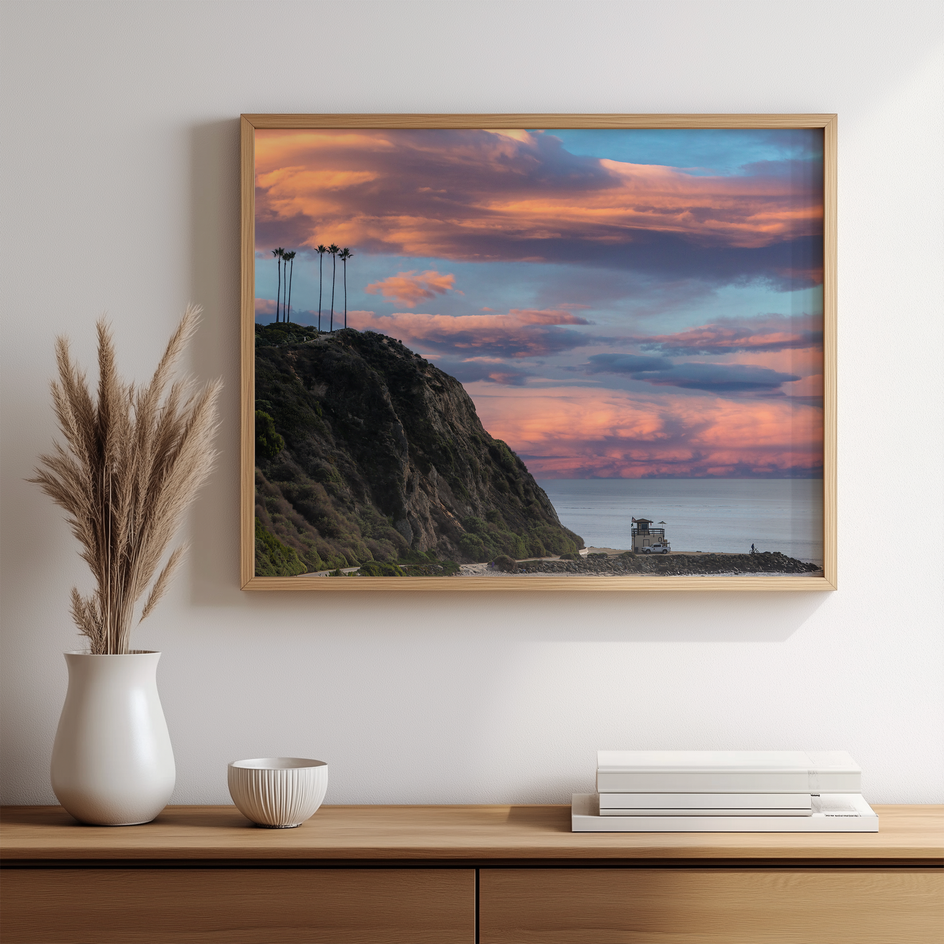 Awash in soft pastels and sculpted light, "Salt Creek Sunset" captures the iconic bluff as it meets a sky painted in sweeping tones of peach, lavender, and blue. Tall palms stand in quiet silhouette above the coastline, while the lifeguard tower anchors the scene with a touch of human presence. The landscape dissolves gently into layered color and atmosphere, transforming a fleeting Southern California sunset into a serene, timeless expression of coastal beauty.