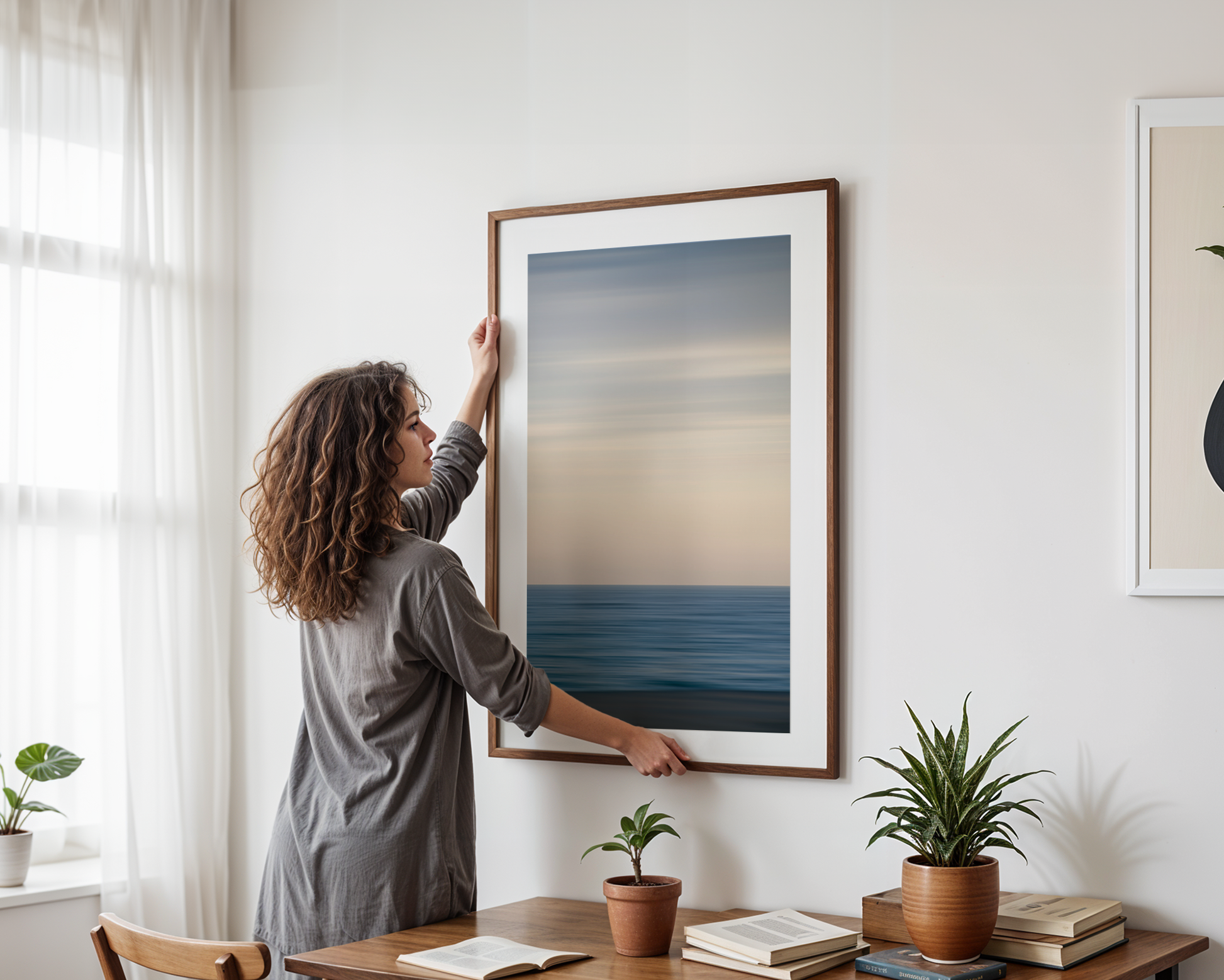 - Custom frames available in natural wood, black, white, and walnut finishes