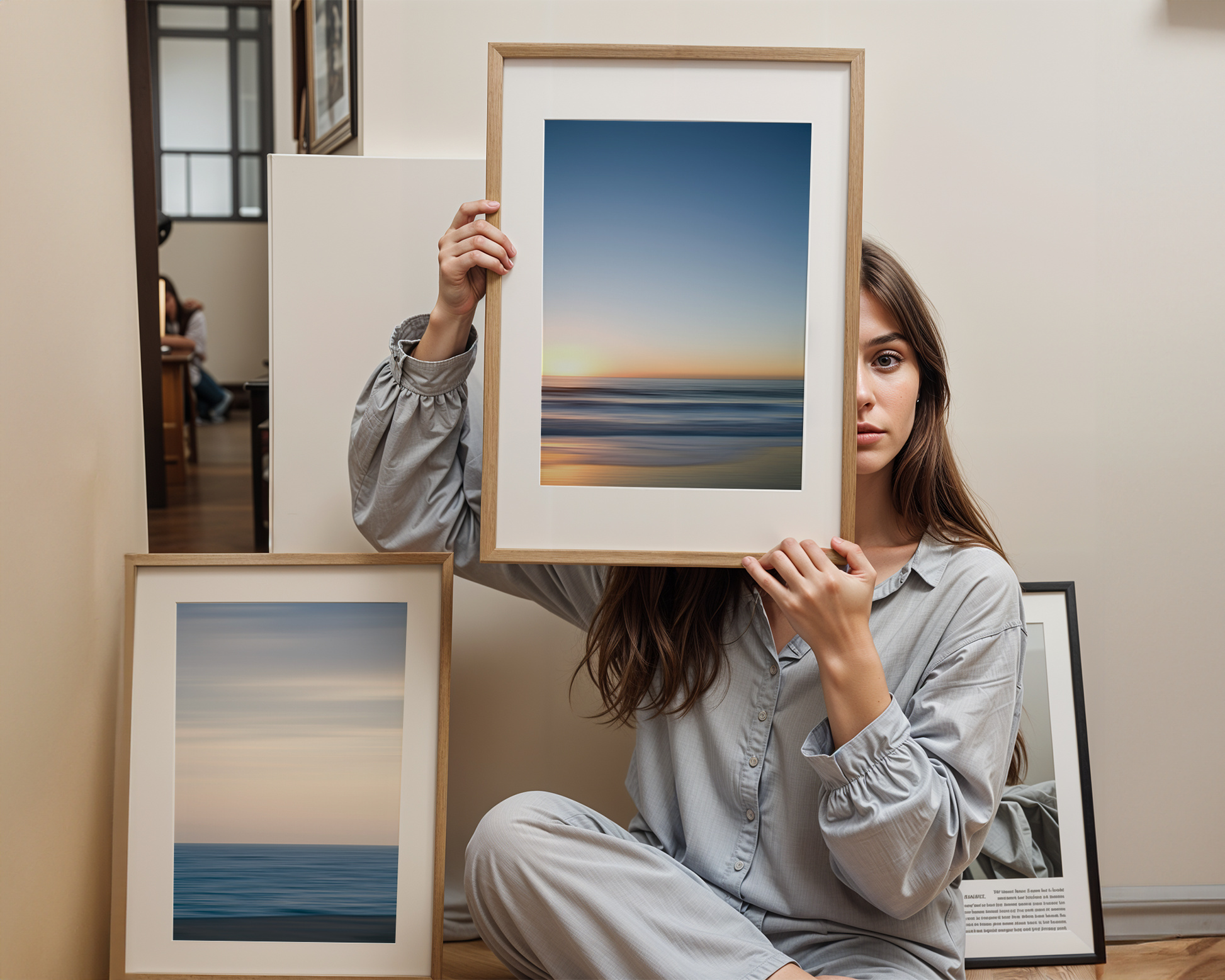 - Custom frames available in natural wood, black, white, and walnut finishes