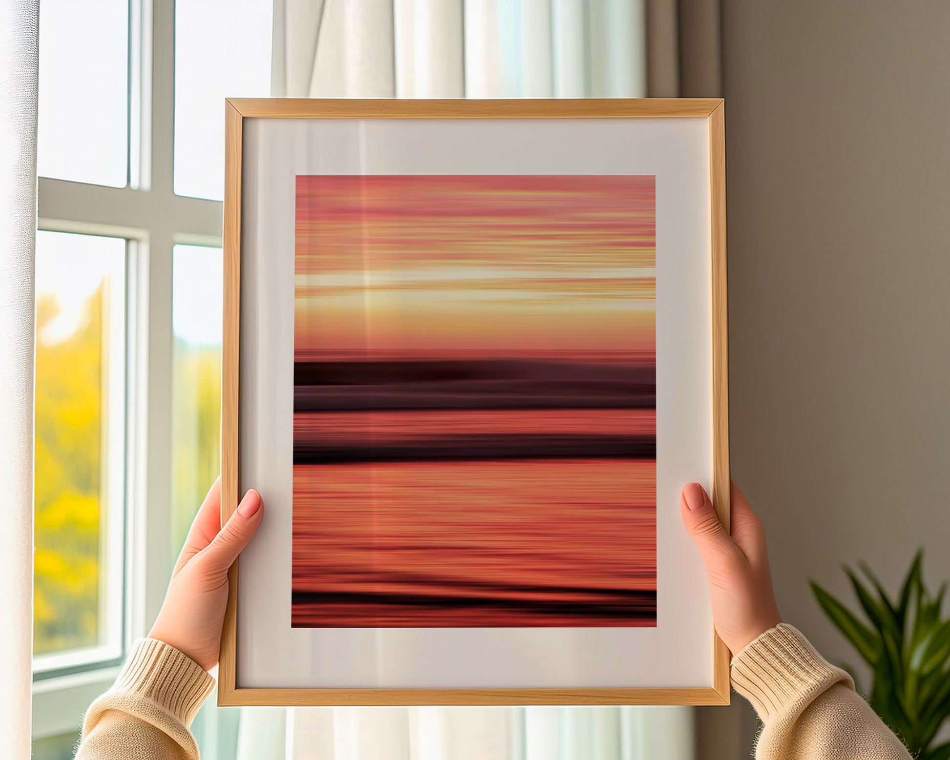 Radiating with the fiery glow of sunset, "Coastal Ember No. 02" captures the ocean bathed in luminous hues of orange, gold, and crimson. Gentle horizontal motion softens the seascape into abstract layers of color, transforming the fleeting moment of dusk into a timeless vision of warmth and light.