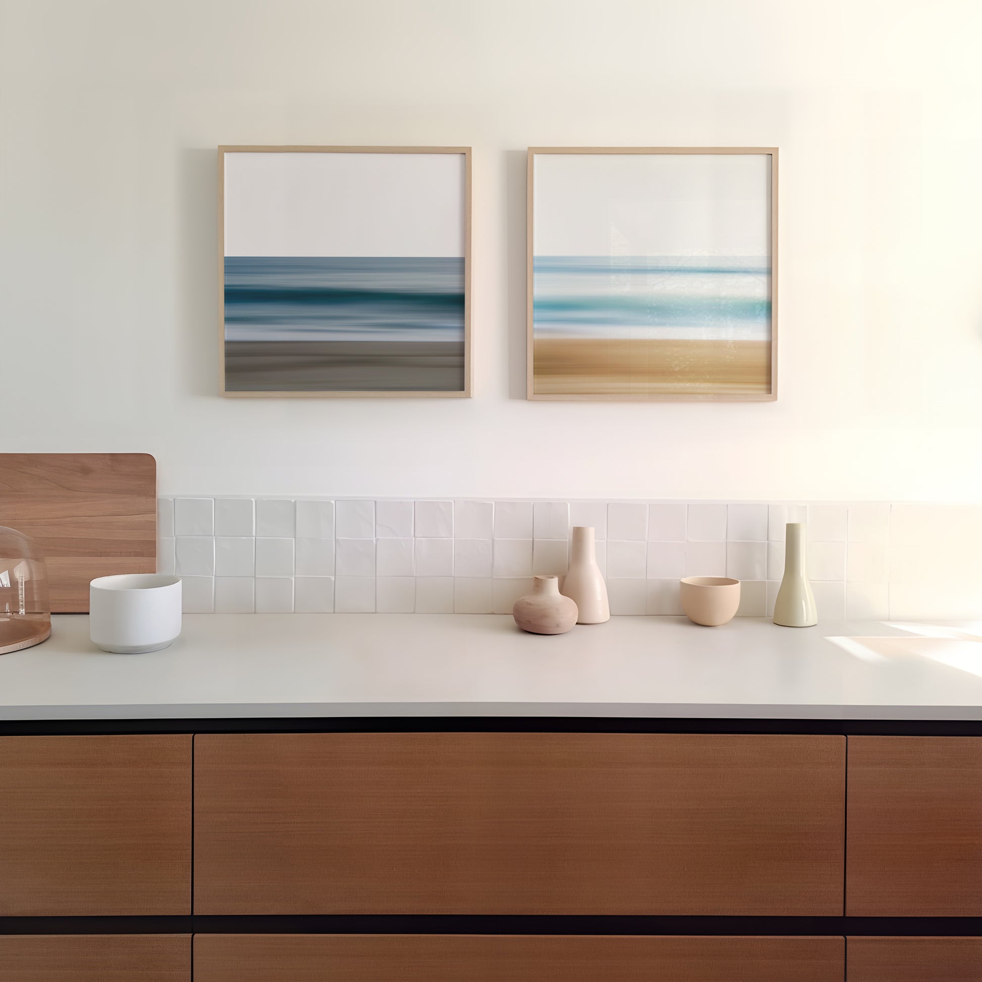 Minimalist Ocean Wall Art Set -- Bring a sense of serenity to your space with the Tranquil Tides Pairing, a beautifully balanced duo of coastal fine-art prints designed to complement each other in color, texture, and mood. Together, these pieces create a gentle visual rhythm ... soft horizons, subtle movement, and the quiet poetry of the shoreline.